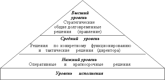 Иерархия управления — инструмент для реализации целей фирмы и гарантия сохранения системы. Чем выше иерархический уровень, тем больше объем и комплексность выполняемых функций, ответственность, доля стратегических решений и доступ к информации. Одновременно растут и требования к квалификации и личная свобода в управлении. Чем ниже уровень — тем больше простота решений, доля оперативных видов деятельности (рис. 3.3).