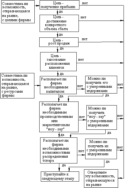 Важнейшим элементом этапа отбора идей, открывающих перед фирмой новые рыночные возможности, является оценка этих возможностей с точки зрения целей и ресурсов фирмы.