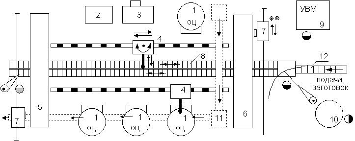Заготовки с обработанными базовыми (технологическими) поверхностями поступают по транспортеру 12 на шариковый стол, где с помощью ручного манипулятора устанавливаются на специальные приспособления — "спутники" (палеты). На каждую заготовку приклеивается магнитный информационный носитель, в котором содержится информация о заготовке (номер, материал и т.д.). По команде оператора робот-штабелер устанавливает "спутник" с закрепленной на нем заготовкой в любую свободную ячейку склада заготовок. Считывающее устройство ячейки передает информацию на УВМ участка.