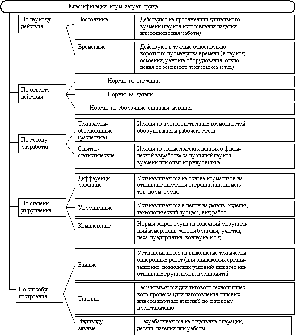 Нормы затрат труда могут устанавливаться на операцию, изделие, работу, комплекс работ. Они различаются по периоду и сфере действия, по методу установления, степени укрупнения, по способу построения и т.д.