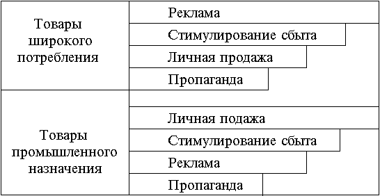 Фирмы товаров широкого потребления, как правило, тратят средства в основном на рекламу и только потом — на стимулирование сбыта, организацию личной продажи и в последнюю очередь на пропаганду.