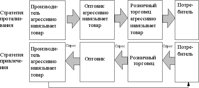 Стратегия проталкивания товара и стратегия привлечения потребителя к товару.