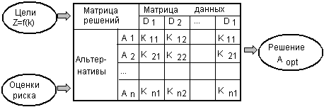 По прогнозируемым пакетам данных D могут быть рассчитаны для альтернативных решений А прогнозируемые результаты К. Далее с учетом возможности риска выбирается альтернатива Aopt, которая наилучшим образом соответствует цели А.