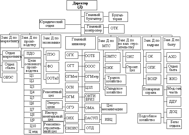 | АХО — административно-хозяйственный отдел. БРИЗ — бюро рационализации и изобретательства. ВОХР — вооруженная охрана. ДДУ — детские дошкольные учреждения. ДОЦ — детский оздоровительный центр. ЖКО — жилищно-коммунальный отдел. ИВЦ — информационно-вычислительный центр. Медсанчасть — медицинская санитарная часть. ОАСУП — отдел автоматизированных систем управления производством. ОВЭС — отдел внешних экономических связей. ОГК — отдел главного конструктора. ОГМ — отдел главного механика. ОГМет — отдел главного металлурга. ОГМетр — отдел главного метролога. ОГТ — отдел главного технолога. ОГЭ — отдел главного энергетика. ОИХ — отдел инструментального хозяйства. | ОК — отдел кадров. ОКК — отдел кооперации и комплектации. ОКС — отдел капитального строительства. ОМА — отдел механизации и автоматизации. ОМТС — отдел материально-технического снабжения. ОНЗИС — отдел надзора за зданиями и сооружениями. ОНТИ — отдел научно-технической информации. ООТБ — отдел охраны труда и техники безопасности. ООТиЗ — отдел организации труда и заработной платы. ОООС — отдел охраны окружающей среды. ОПК — отдел подготовки кадров. ОСН — отдел стандартизации и нормализации. ОТД — отдел технической документации. ОТК — отдел технического контроля. ПДО — планово-диспетчерский отдел. ПЭО — планово-экономический отдел. ФО — финансовый отдел. ЦЗЛ — центральная заводская лаборатория. |