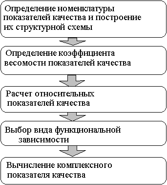 При применении комплексного метода применяют комплексный показатель качества, который определяется путем сведения воедино отдельных показателей с помощью коэффициентов весомости каждого показателя. При этом может быть использована функциональная зависимость: