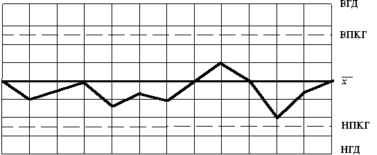 На горизонтальной оси указываются номера выборок (за смену, сутки, неделю, месяц); на вертикальной оси откладываются размер выбранной характеристики X, контролируемого параметра, нижняя и верхняя границы допуска (НГД, ВГД); нижняя и верхняя предупредительные границы (НПКГ, ВПКГ).