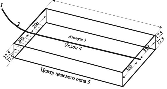 Рисунок 1.1 - Целевые параметры горизонтального участка скважины. 1 – траектория скважины, 2 – целевое окно, 3 – азимут, 4 – наклон ствола, 5 – центр целевого окна