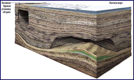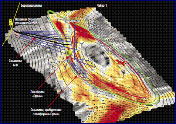 Рис. 1.4. Структурная карта показывает общий план скважин, построенных как с береговой буровой установки «Ястреб», так и с морской платформы «Орлан».