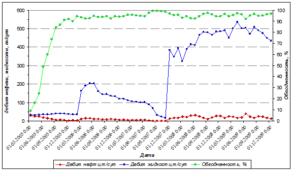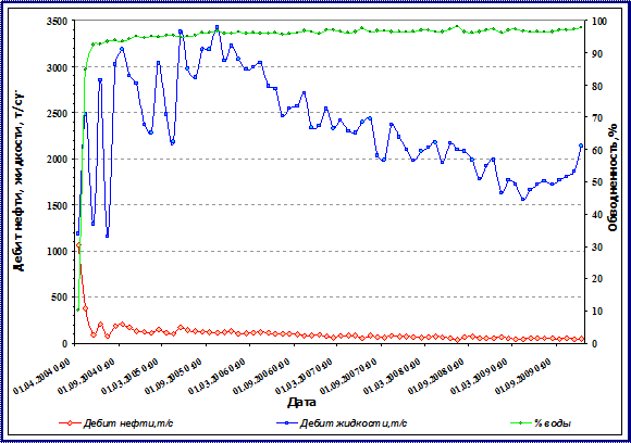 Анализ технологических показателей эксплуатации скважин с боковыми горизонтальными ответвлениями показывает, что входной дебит по нефти практически равен проектному, но через 6 месяцев эксплуатации наблюдается резкое падение дебита нефти и рост обводненности (рисунок 1.42).