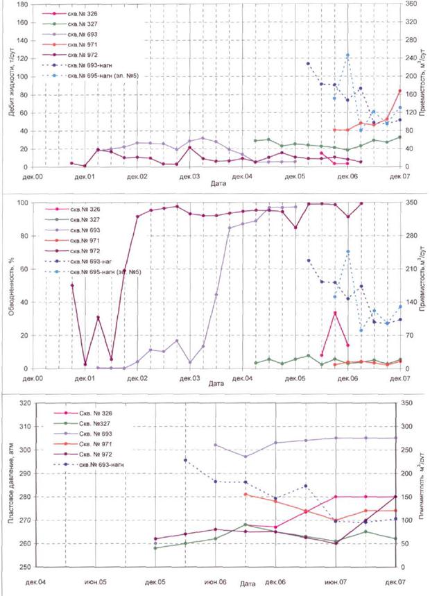 Рис. 1.24. – Динамика дебитов жидкости, обводненности и пластового давления по скважинам элемента 1. Северный участок ОПР. Родниковое месторождение
