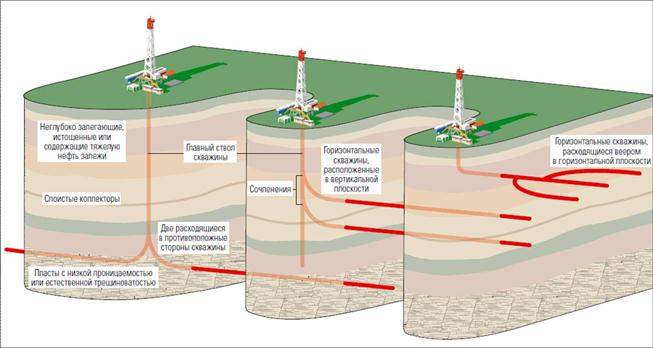 Многоствольные горизонтальные скважины зачастую оказываются эффективнее одиночных при извлечении углеводородов (рис. 1.29.), которые либо находятся в четко обособленных частях залежи, либо образовались в результате частичной выработки запасов.