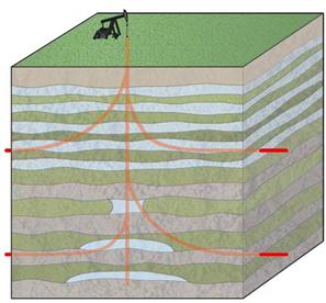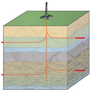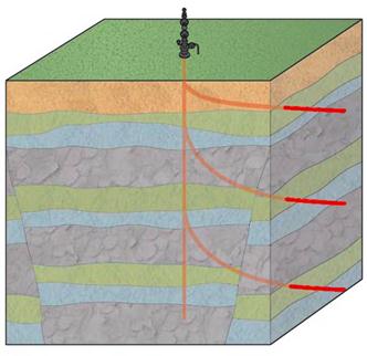 В случае многослойных залежей (рис. 1.28.), несколько горизонтальных скважин, расположенных в вертикальной плоскости, образуют большую площадь контакта с продуктивными пластами, чем одна вертикальная скважина, и могут эксплуатировать одновременно несколько продуктивных интервалов. Изменяя наклон ствола и вертикальную глубину каждой дренирующей скважины, можно одновременно эксплуатировать несколько маломощных пластов.