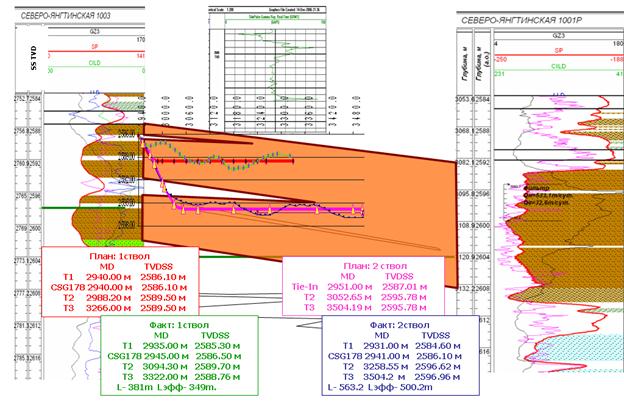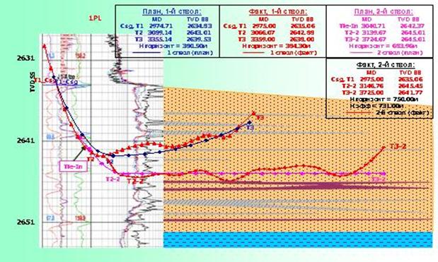 Рис. 1.34. Проектный и фактический профиль многоствольной горизонтальной скважины № 1Г