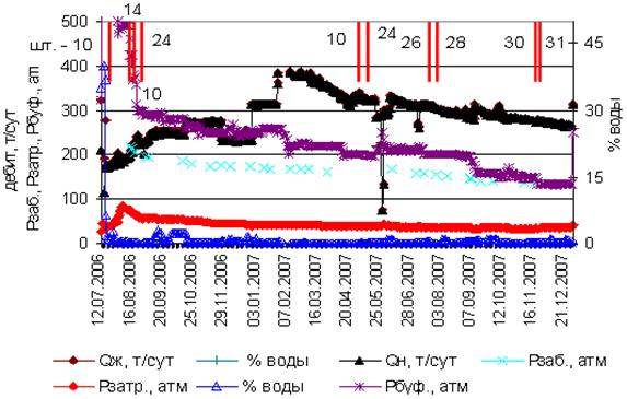 Рис. 1.53. Динамика технологических показателей эксплуатации второго горизонтального ствола скважины №1558