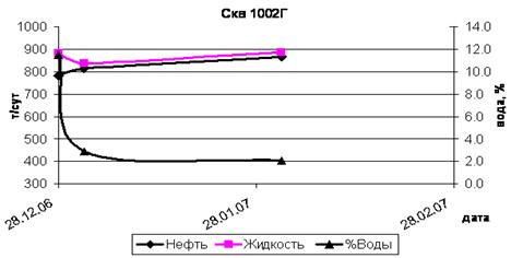Скважина 1002Г была сдана в конце 2006года с параметрами: Q ж=884.54 т/сут, Q н=866.18 т/сут, воды – 2.1% (рис. 1.36–1.37). Динамический уровень составляет 300 м, в скважину спущена установка ЭЦН с датчиком давления, Р з= 22.6 МПа.