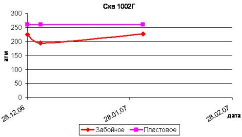 Рис. 1.37. Динамика пластового и забойного давления в зоне отборов скважины 1002Г