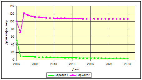 Рис. 1.41. Динамика дебитов нефти по вариантам, скважина №3725, пласт ЮС1 Федоровского месторождения