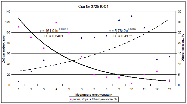 Рисунок 1.42 - Динамика дебитов и обводненности по скважине №3725 Федоровского месторождения