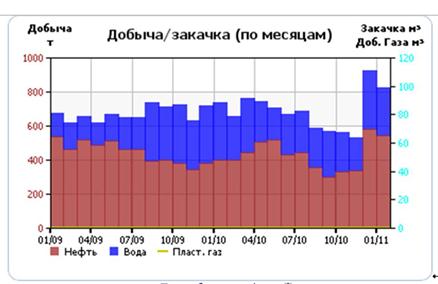 ‑ динамика обводнения в значительной мере определяется результатами работ по ГРП, объемами закачки, а также неоднородностью геологического строения пласта.