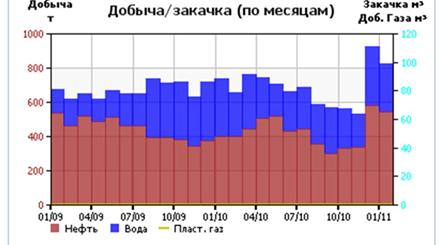 После строительства и освоения горизонтальных стволов скважины №1558 технологические показатели эксплуатации были много выше начальных (рисунок 1.52, 1.53). По состоянию на 01.01.2011 г. дебит по нефти составил 34,5 т/сут, суммарная накопленная добыча по нефти - 46 300 т.