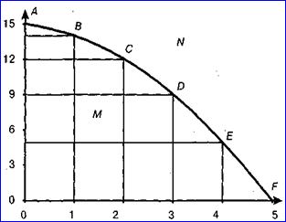 График границы производственных возможностей показывает, что национальная экономика, полностью реализующая потенциал, не может увеличить производство какого-либо блага, не поступившись другим. Функционирование экономики на границе своих производственных возможностей (т. АBCDEF) говорит об ее эффективности. Любая комбинация 2–ух благ (масло и пушки), соответствующая точка М характеризует неполное (неэффективное) использование ресурсов. Производство при данных ресурсах и существующей технологии на основе выбора точки N вообще неосуществимо для экономики, т.к. эта точка лежит за пределами КПВ.
