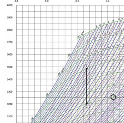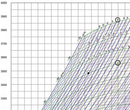 Найдя эту точку мы уже можем определить энтальпию и энтропию в этой точке. Опустив на оси проекции найденной точки, узнаем значения энтальпии (ось «Y») и энтропии (ось «Х»).