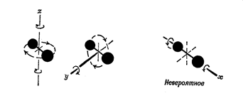 Для двух-атомного водорода атомы в молекуле попарно связаны друг с другом типа гантели. Можно предположить, что кроме движения относительно трех осей координат молекула водорода может вращаться подобно гантели относительно двух осей перпендикулярных двум плоскостям относительно продольной оси «гантели» (см. рис.2.2.1).