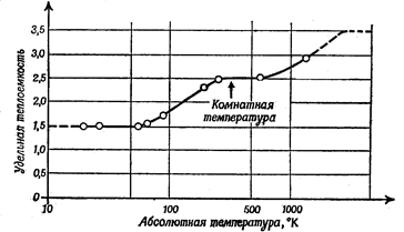 Иллюстрацией изменения удельной теплоемкости водорода в зависимости от абсолютной температуры является Рис.2.5. По ординате рис. 2.5 отложено отношение молярной теплоемкости водорода при постоянном объеме к его газовой постоянной.