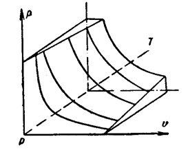 Однако для общего рассмотрения оказывается необходимым учитывать силы межмолекулярного сцепления и размеры молекул. Например, нельзя уравнениями идеального газа пользоваться для случаев фазовых переходов. Появляется необходимость учитывать особенности поведения реальных газов. Так для идеального и реальных газов можно рассмотреть поверхности состояния (рис. 3.1 и рис.3.2).