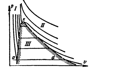 На рис.3.2 была приведена поверхность состояния реального рабочего тела в координатах p, υ и T. Ее можно рассматривать как фазовую диаграмму. Имеются характерные точки, определяющие фазовое состояние веществ, так называемые критические и тройные точки. Понятие тройной и критической точек ясно из Рис.3.7 и Рис.3.3. Критическая точка k определяет особенность перехода на границе газ-жидкость и будет рассмотрена ниже. При давлениях выше критического газообразная фаза переходит в жидкую и обратно без скачка плотности (процесс I-II). Кривая же плавления не имеет такого ограничения вплоть до очень высоких изученных уровней давлений.