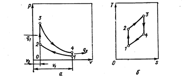 Цикл работы поршневого двигателя с подводом тепла при V = const (Отто) изобразится в координатах p - V (рис.5.2,а) и T – S (рис. 5.2, б):
