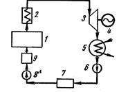 Химическая энергия топлива при его сжигании превращается во внутреннюю энергию продуктов сгорания, которая в виде теплоты передается воде и пару в котле 1 и перегревателе 2. Полученный пар направляется в паровуюбину 3, где и происходит преобразование теплоты в механическую работу, а затем обычно в электричекую энерию в электрогенераторе 4. Отработавший пар поступает в конденсатор 5, где отдает отдает теплоту охлаждающей воде. Полученный конденсат конденсационным насосом 6 направляется в питательный бак 7, откуда питательная вода забирается питательным насосом 8, сжимается до давления, равного давлению в котле, и подается через подогреватель 9 в паровой котел.