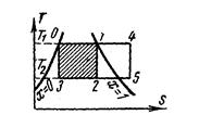 Если в цикле Ренкина учитывать работу насоса, то процесс адиабатного сжатия воды в нем представится на TS-диаграмме адиабатой 2/-3, а изобара 3-4 соответствует нагреванию воды в котле при давлении р1 до соответствующей температуры кипения.
