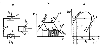 Компрессор 4 засасывает из испарителя 1 сухой насыщенный или слегка перегретый пар хладагента, адиабатно сжимает его до давления р2 (процесс 1-2). Из компрессора перегретый пар поступает в конденсатор 3, где охлаждается до температуры конденсации tк (процесс 2-3), а затем конденсируется (процесс 3-4/-4), отдавая в окружающую среду теплоту q2. После конденсации жидкий хладагент подвергается дросселированию в специальном клапане 2 (процесс 4-5). Полученный влажный пар при давлении рисп поступает в испаритель, где и испаряется при температуре tисп, отбирая теплоту q1 от охлаждаемой среды (процесс 5-1).