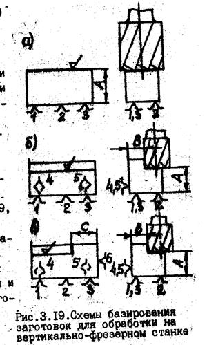 В первом случае (рис. 5а) фрезеруется только верхняя плоскость в размер А. Для достижения этого размера достаточно только одной установочной базы с опорными точками 1, 2 и 3.Положение заготовки в остальных координатных направлениях для получения размера А не имеет значения, лишь бы фреза перекрывала ширину обрабатываемой поверхности и рабочий ход перекрывал длину фрезеруемой плоскости.