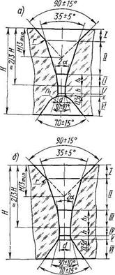 а — волоки с диаметром калибрующих отверстий до 0,1 мм, б — волоки с диаметром калибрующих отверстий 0,1—0,5 мм, в — волоки с диаметром калибрующих отверстий более 0,5 мм, /—входная распушка, // — смазочный конус, III — рабочий конус, IV — калибрующая зона, V — обратный конус, VI — выходная распушка