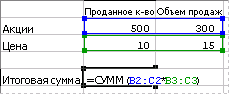 При вводе формулы ={СУММ(B2:С2*B3:С3)} в качестве формулы массива она перемножает количество акций на цену каждой акции (500*10 и 300*15), после чего складывает результаты этих вычислений, что дает общую сумму 9500.