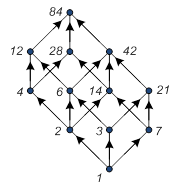 На рис. 5.1 показан упрощенный граф отношения «быть делителем» из (9). На графе наглядно прослеживается структура упорядоченного множества. Так, для подмножества Q = {4, 6, 14, 28, 42} мажорантой является элемент 84, а минорантами - элементы 1 и 2. Максимума и минимума Q не имеет, но sup Q = 84, inf Q = 2. Для всего множества единственная мажоранта 84 является одновременно максимальным элементом, а миноранта 1 - минимальным элементом.