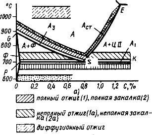 Рис. 7.3. Температуры нагрева при отжиге и закалке сталей.
