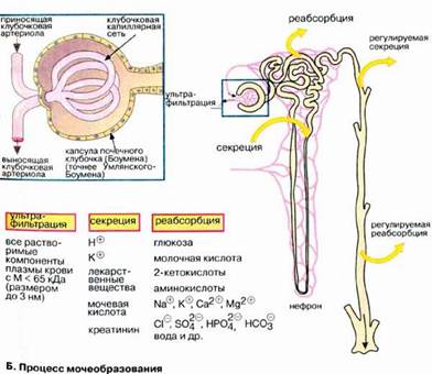 Обмен веществ. Процессы концентрирования и селективного транспорта требуют больших затрат энергии. Необходимый АТФ синтезируется за счет окисления жирных кислот, кетоновых тел и некоторых аминокислот и в меньшей степени лактата, глицерина, цитрата и глюкозы, которые содержатся в крови. В почках так же, как и в печени, может идти процесс глюконеогенеза. Субстратами служат углеродные скелеты глюкогенных аминокислот, азот которых в форме аммиака используется для регуляции рН мочи (см. рис. 319). В почках обнаружены ферменты расщепления пептидов и метаболизма аминокислот, обладающие высокой активностью (например, оксидазы аминокислот, аминооксидазы, глутаминаза).