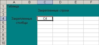 При работе с большими электронными таблицами иногда возникают трудности, связанные с тем, что когда вы листаете файл в поисках нужной ячейки, пропадают из вида заголовки строк и столбцов. Для более удобной работы с таблицами в Microsoft Excel есть функция закрепления областей. Закрепленная область представляет собой либо один или несколько первых столбцов (слева), либо одну или несколько первых строк (сверху). Для того чтобы закрепить область в Excel необходимо выделить ячейку на пересечении предполагаемых областей, но не находящеюся в ней. Например, если вы хотите закрепить три строки и два столбца нужно выделить ячейку С4 (Рис.1).
