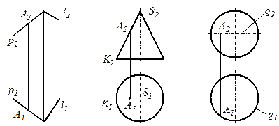 На рис. 18 показана точка A, принадлежащая плоской, конической и сферической поверхностям, так как она задана на линиях этих поверхностей: на плоскости Γ (p ∩ l) точка А принадлежит прямой p, на конической поверхности образующей SK, а на сферической принадлежит окружности q.