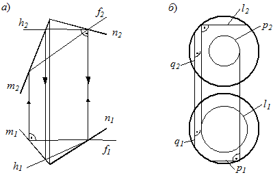 Примеры построения прямых уровня – горизонтали h и фронтали f, принадлежащих плоской поверхности, заданной пересекающимися прямыми m и n, приведены на рис. 24, а. На сферической поверхности окружности l, p и q соответственно линии горизонтального, фронтального и профильного уровня (рис. 24, б).