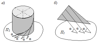 Линию поверхности, касательные, в каждой точке которой образуют равные углы с плоскостью проекций, называют линией одинакового наклона. На рис. 25, а показана линия одинакового наклона цилиндрической поверхности к горизонтальной плоскости проекций – цилиндрическая винтовая линия (см. лекция 8) и прямые одинакового наклона плоскости треугольника (рис. 25, б).