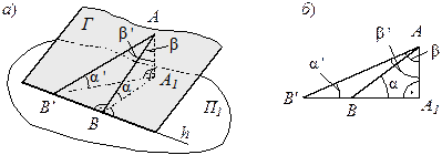Предположим, что существует угол α', который больше чем α. Этот угол образован прямой AB', принадлежащей плоскости Γ, которая является наклонной по отношению к горизонтали h. Для опровержения высказанного предположения рассмотрим прямоугольные треугольники ABA1 и AB'A1 (рис. 26, а, б), в которых гипотенуза AB и катет A1B одного треугольника меньшесоответственно AB' и A1 B' другого треугольника,так как AB и A1B перпендикуляры к горизонтали h, а AB' и A1B' - наклонные. Следовательно, угол β < β'. И поскольку α + β = 900 и α' + β' = 900, то угол α > α'.