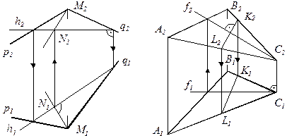 На рис. 27 приведены примеры построения на комплексном чертеже прямых наибольшего наклона MN и KL, расположенных соответственно в плоскостях Γ(p ∩ q) и ABC. Прямая MN, построенная в плоскости Γ перпендикулярна ее горизонтали h, является прямой ската, а KL, построенная в плоскости ABC, является прямой наибольшего наклона к фронтальной плоскости проекций.