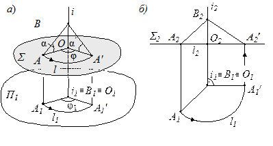 Рассмотрим механизм вращения вокруг проецирующей оси на примере отрезка прямой (АВ). Пусть ось вращения i, проведенная через точку В, перпендикулярна, например, горизонтальной плоскости проекций Π1 (рис. 32, а). В этом случае точка В, как и любая другая точка, принадлежащая оси, неподвижна, а точка А заданной прямой совершает вращательное движение в плоскости Σ. Повернувшись на некоторый угол φ, точка А займет положение А'. При этом очевидно, что величина угла наклона прямой АВ к горизонтальной плоскости проекций не изменит своей величины, т. е. α' = α. Отсюда вытекает основное свойство проекций при вращении вокруг проецирующей оси. Соответствующая проекция не меняет своей формы и размеров. В приведенном на рис. 32, а примере, такой проекцией является горизонтальная проекция А1В1 отрезка АВ, т. е. А1В1 = А1'В1.