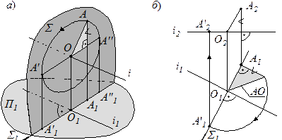 Для построения горизонтальной проекции (А1') нового положения заданной точки следует отложить полученную величину радиуса вращения от проекции О' вдоль вырожденной проекции (Σ1) плоскости вращения. Затем строится фронтальная проекция А2' из условия, что точка А расположена на одном уровне с осью i (см. рис. 33, б).