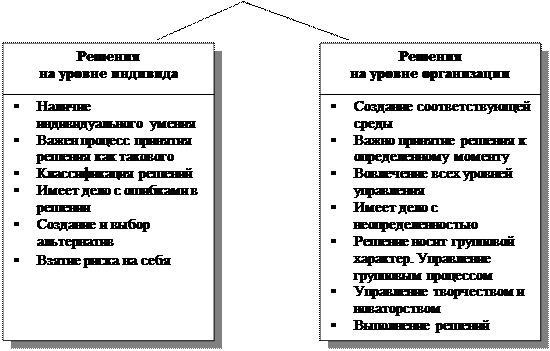 В управлении организацией принятие решений осуществляется менеджерами различных уровней и носит достаточно формализованный характер, так как дело касается не только одной личности, а чаще всего оно относиться к подразделению или к организации в целом. Выделяют два уровня решений в организации: индивидуальный и организационный.