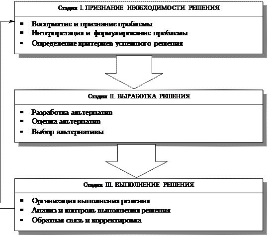Принятие решений в управлении представляет собой сложный и систематизированный процесс, состоящий из ряда этапов и стадий, начинающийся с формулирования проблемы и заканчивающийся совершением действий, решающих эту проблему.